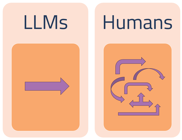 Humans draw on the lived experience of frustration, delay, and trial-and-error learning. LLMs only know what exists in text, with no practical experience.